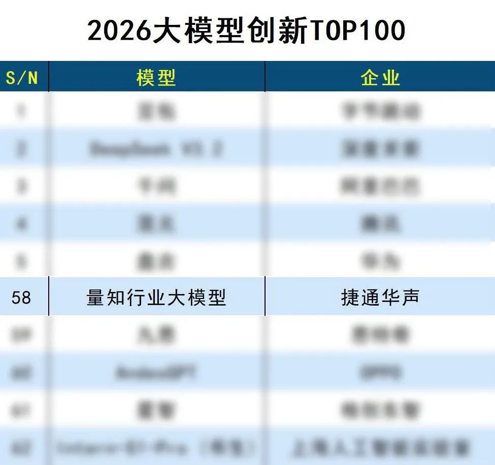 捷通华声荣登“2026大模型创新TOP100” 榜单